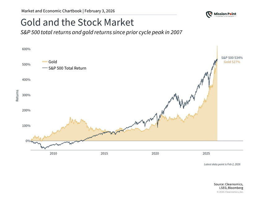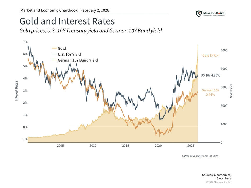 In other words, investors aren’t buying gold because they expect rates to collapse tomorrow. They’re buying it because they’re seeking diversification during a period of heightened uncertainty — which helps explain both gold’s strength and its volatility.